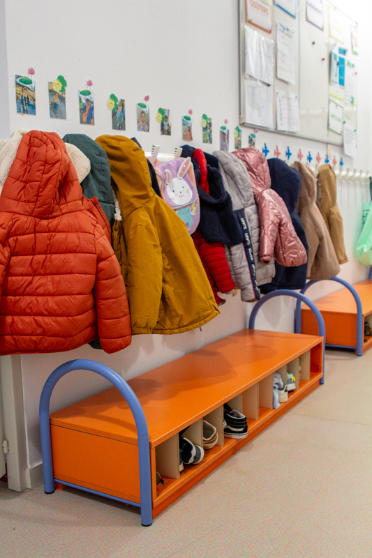 Pour enlever manteau et chaussures, les familles peuvent opter pour la table à langer. Concernant les plus grands, ils peuvent s’asseoir librement sur le banc prévu à cet effet, et ranger leurs effets personnels dans leurs casiers individuels ou au porte manteaux à leur hauteur.