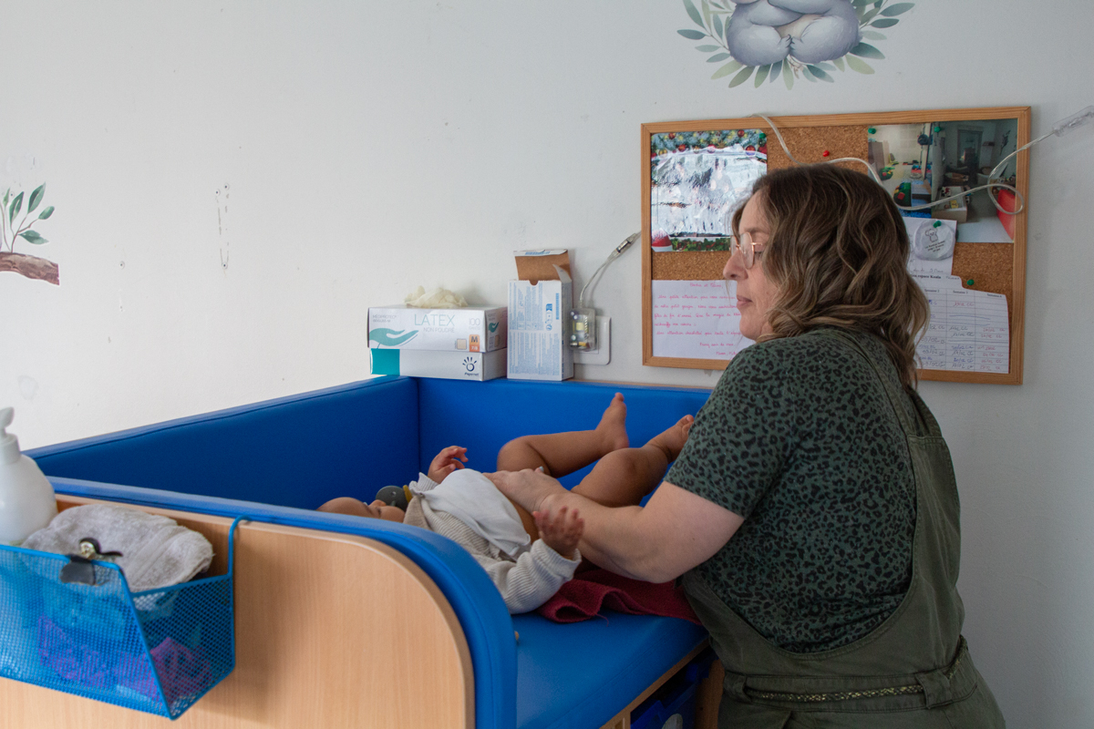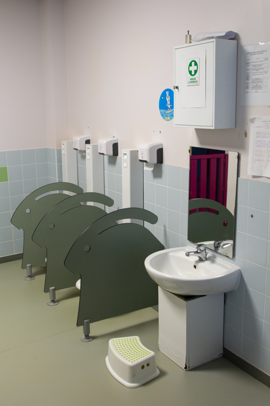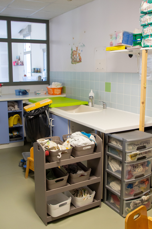 Les enfants les plus jeunes ont un espace de change dans leur lieu de vie et les enfants plus âgés ont une salle de change dédiée avec du mobilier adapté. Les professionnelles pratiquent le change debout pour les enfants qui le souhaitent afin de favoriser une participation active.